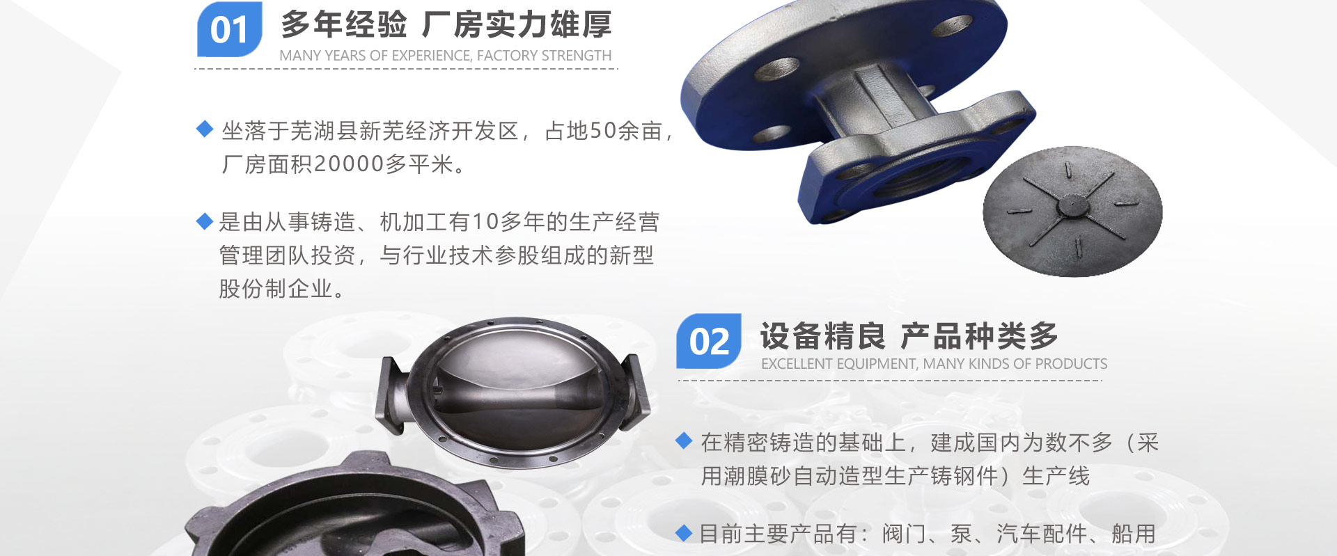 安徽偉工機械科技有限公司,坐落于安徽蕪湖新蕪經(jīng)濟開發(fā)區(qū),是一家専業(yè)從事鑄造產(chǎn)品設計、研發(fā)、生產(chǎn)、銷售于一體的企業(yè),公司為客戶的產(chǎn)品提供多樣的技術(shù)支持與設計,公司主要鑄造技術(shù)有潮模砂鑄造、硅溶膠精鑄工藝。主要產(chǎn)品有:不銹鋼閥門配件、泵閥配件、汽車配件、工業(yè)管道配件、工程機械配件、汽車配件等。材質(zhì)為:低合金鋼、304、316、316L、鉻鉬鋼、哈氏合金、碳鋼、雙相鋼等。公司已先后通過ISO9001和TS16949等多種體系審核,以完備的管理手段和齊全的檢測設備滿足客戶需求,進的設備,専業(yè)的技術(shù),嚴謹?shù)墓芾恚€(wěn)定的質(zhì)量。服務客戶,鑄造未來,偉工誠摯的歡迎新老客戶共同商洽合作